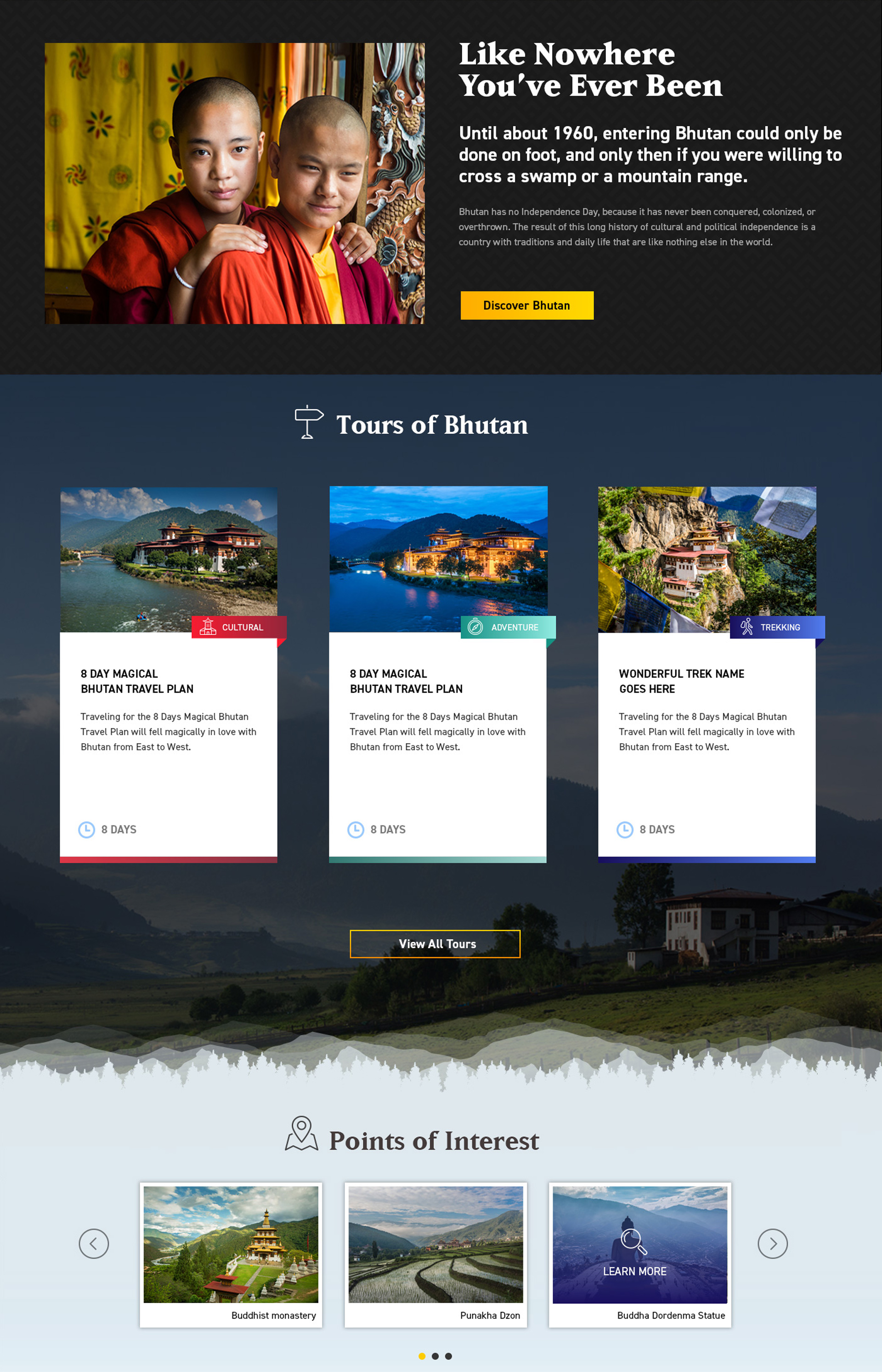 UI/UX design for a travel site focused on promoting curated tours in Bhutan. The work included the visual direction, icon design, information architecture, and layout structure to create a clear, engaging, and culturally rich browsing experience.
