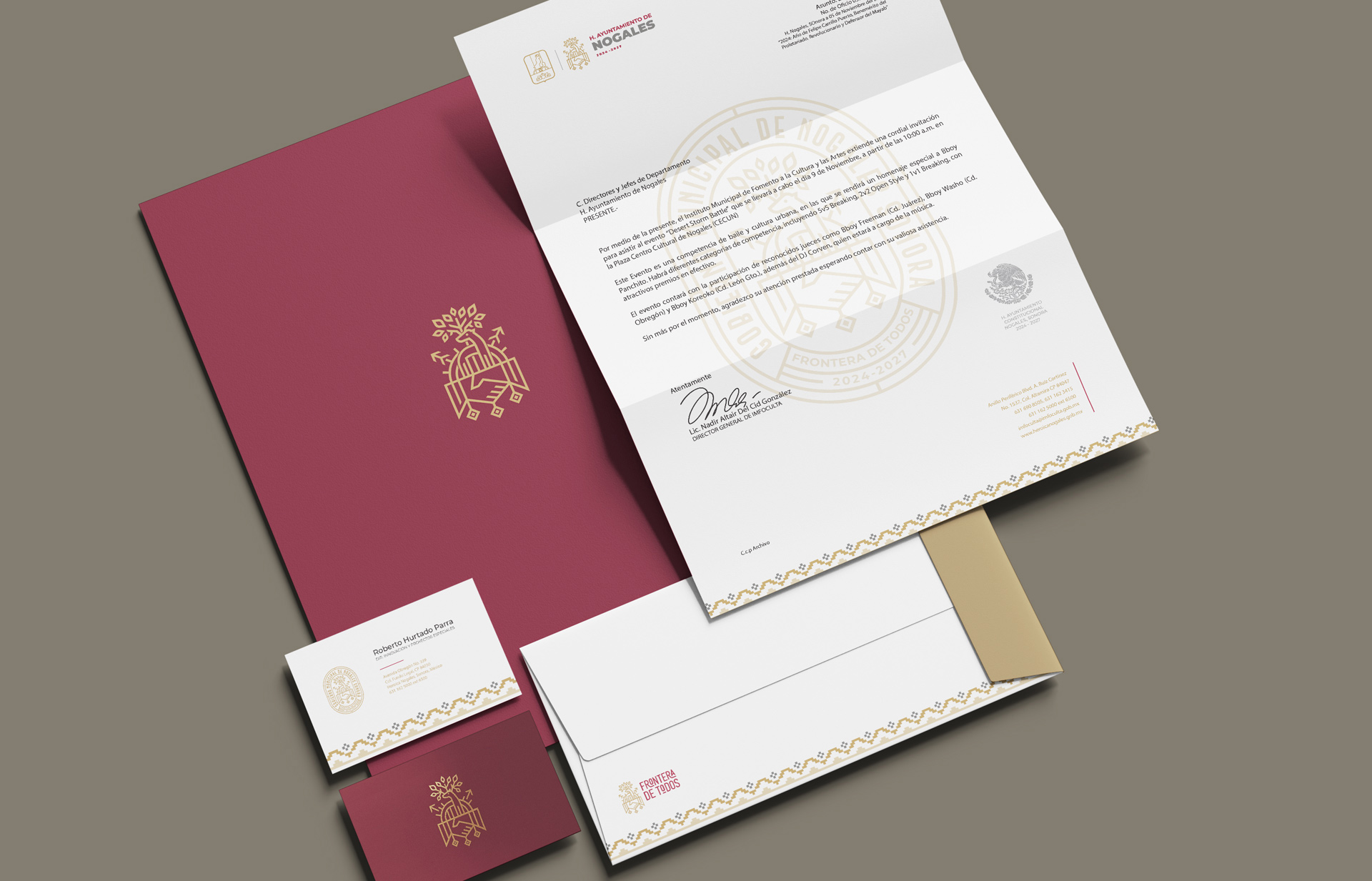 Brand identity created for the 2024–2027 municipal administration, built around symbols representing unity, heritage, and regional growth. The system includes a primary emblem and a set of complementary graphic elements applied across official stationery, communications, and digital platforms. The result establishes a cohesive, contemporary, and functional visual language for all government communication.