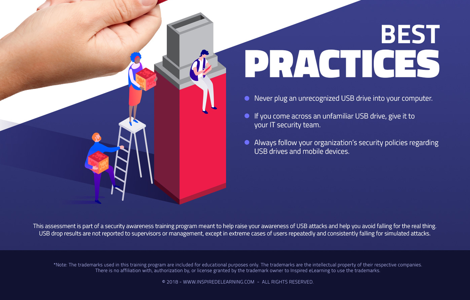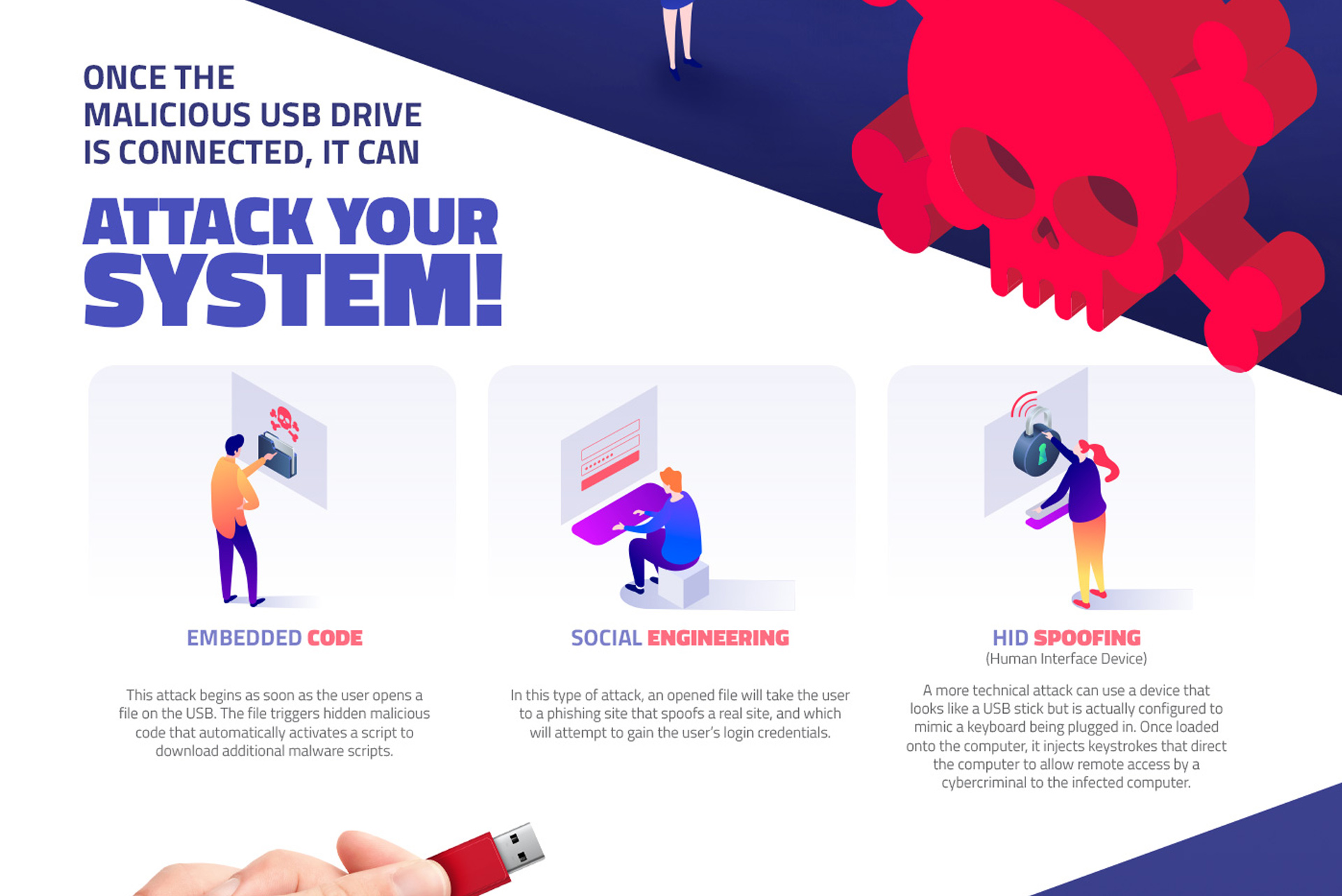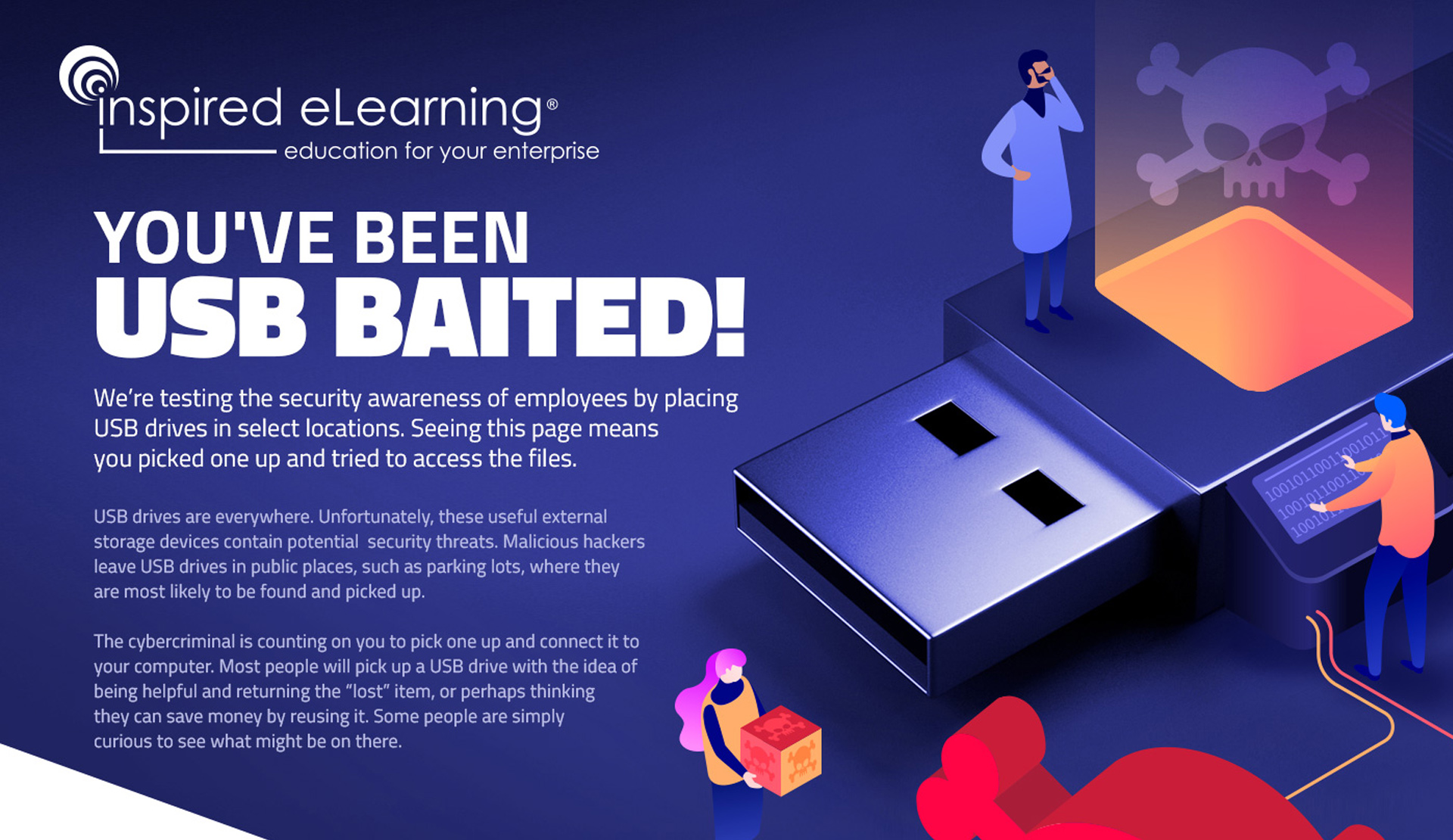 Designed a high-impact awareness landing page used in USB baiting training exercises. When employees plug in a planted “found” USB drive, they are redirected to this page, which explains the simulated attack, highlights the risks, and reinforces cybersecurity best practices through clear visuals and concise messaging.